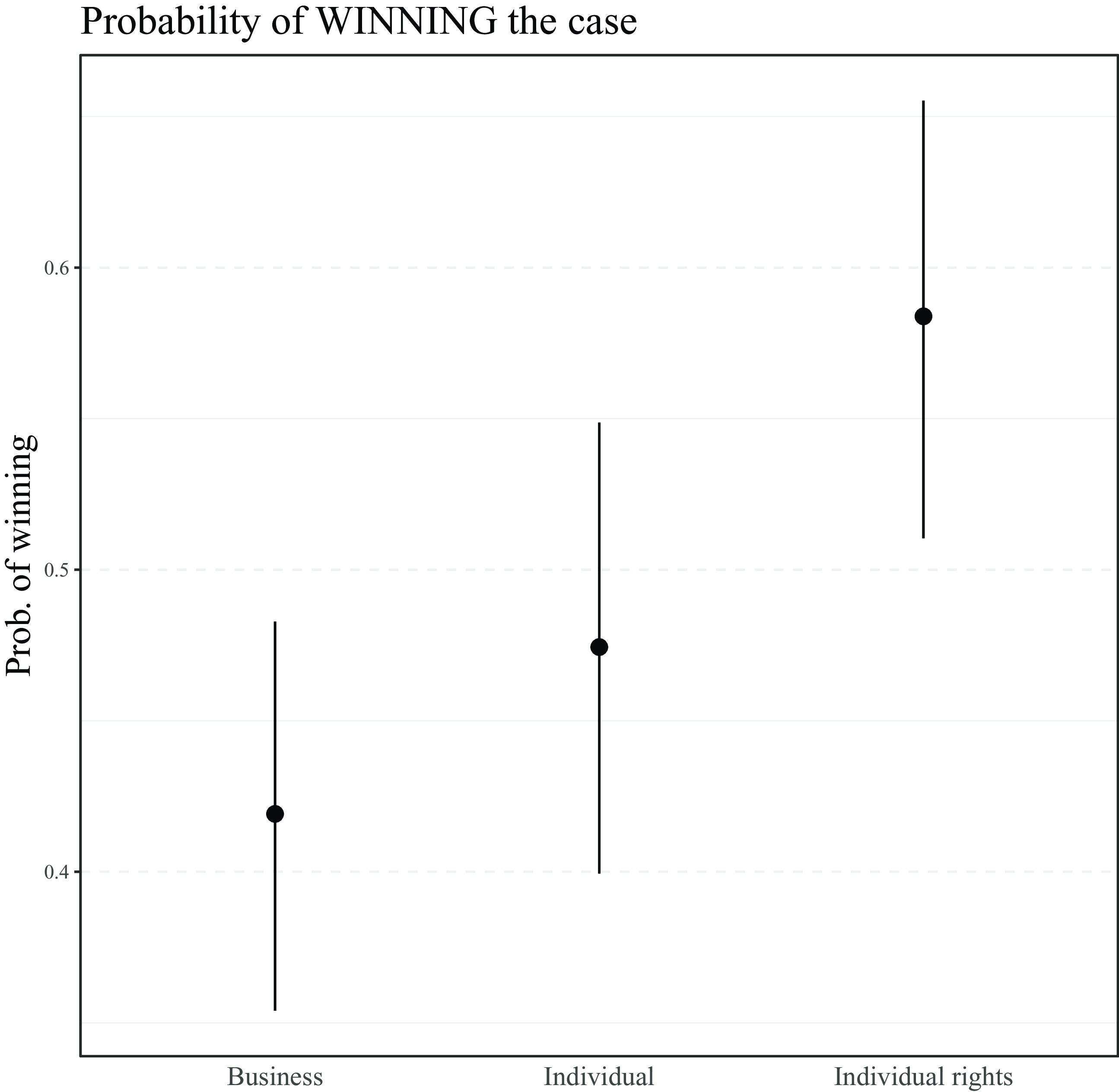 individuals are the least likely to win cases in the US, followed by interest groups (heterogeneous) and governments